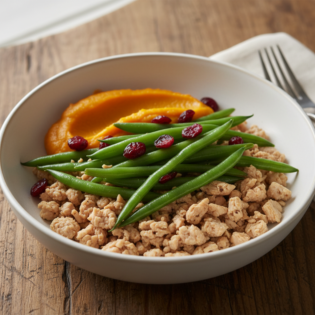 - In a large bowl, combine the cooked turkey, steamed green beans, pumpkin puree, and cranberries.