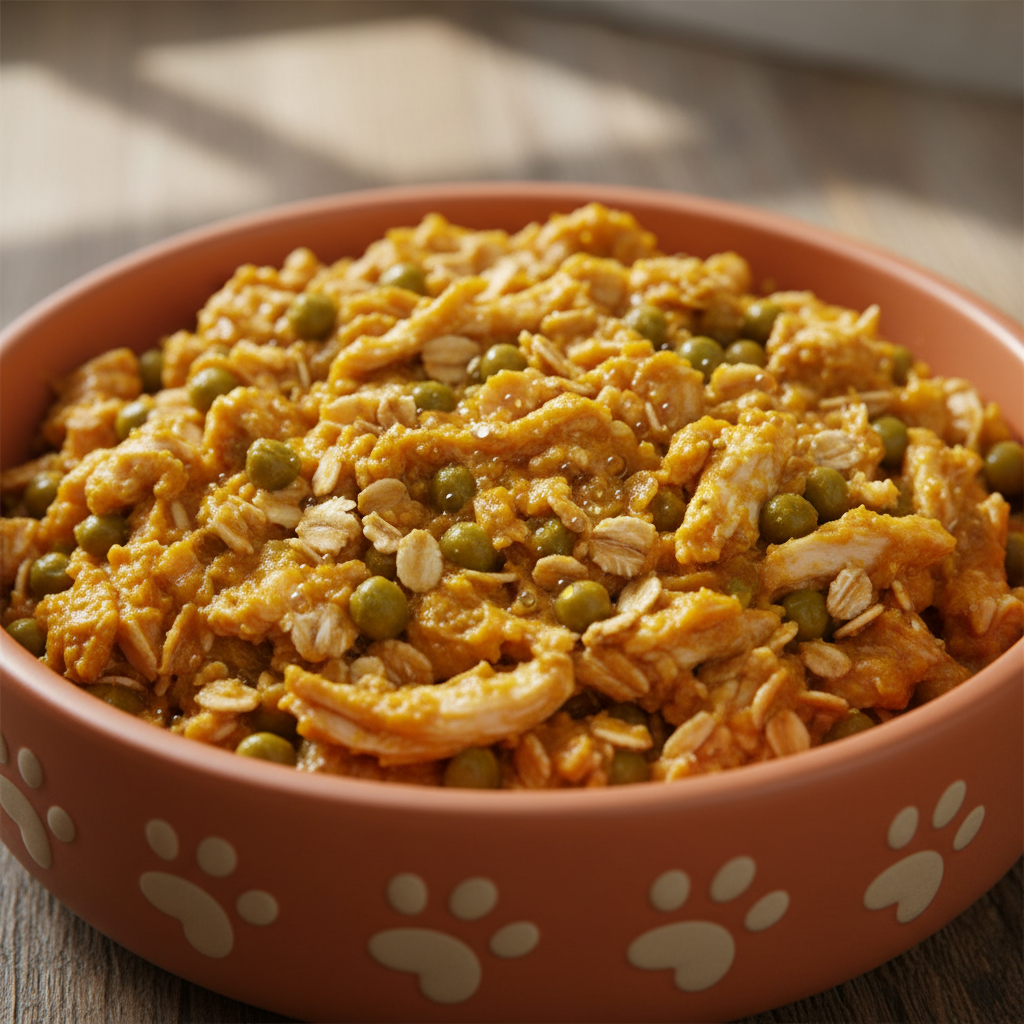 - In a large mixing bowl, combine the cooked chicken, pumpkin puree, cooked oatmeal, and peas.