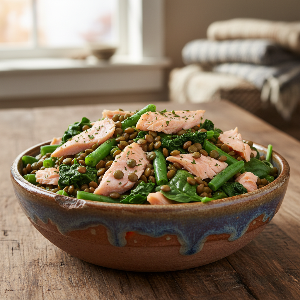 - In a large bowl, combine the flaked salmon, cooked lentils, green beans, and spinach.