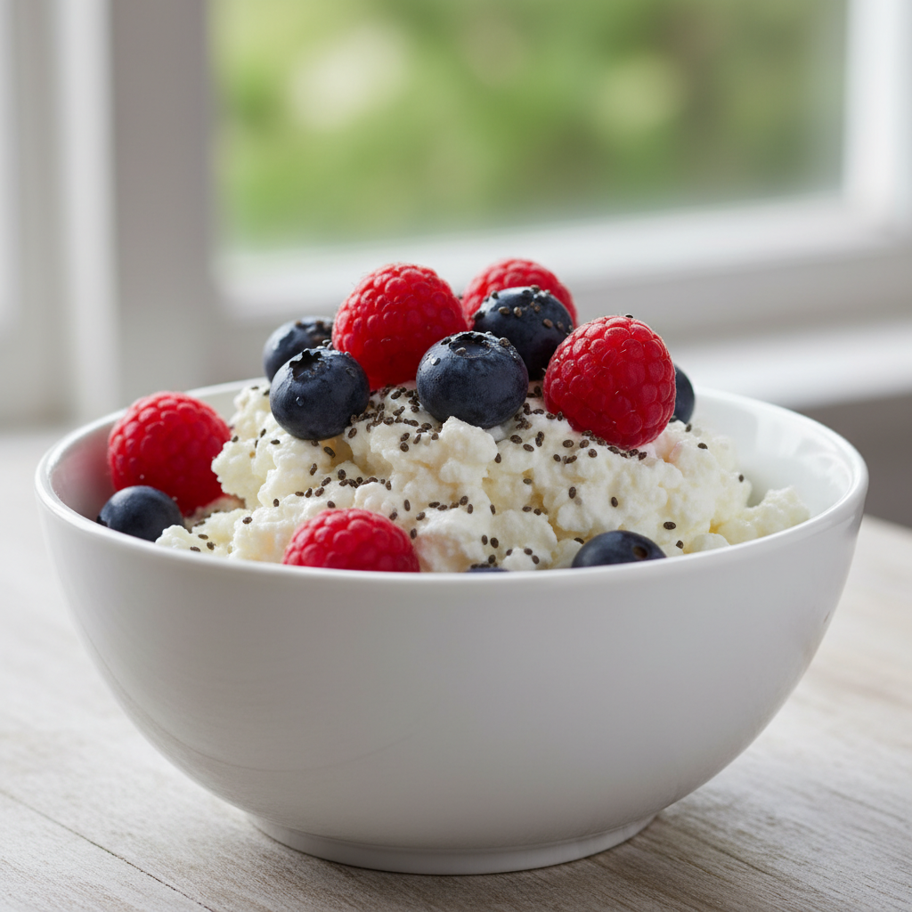 Cottage cheese is high in casein protein, a slow-digesting protein that’s great for muscle repair overnight. Berries are packed with antioxidants, and chia seeds provide fiber and Omega-3s.