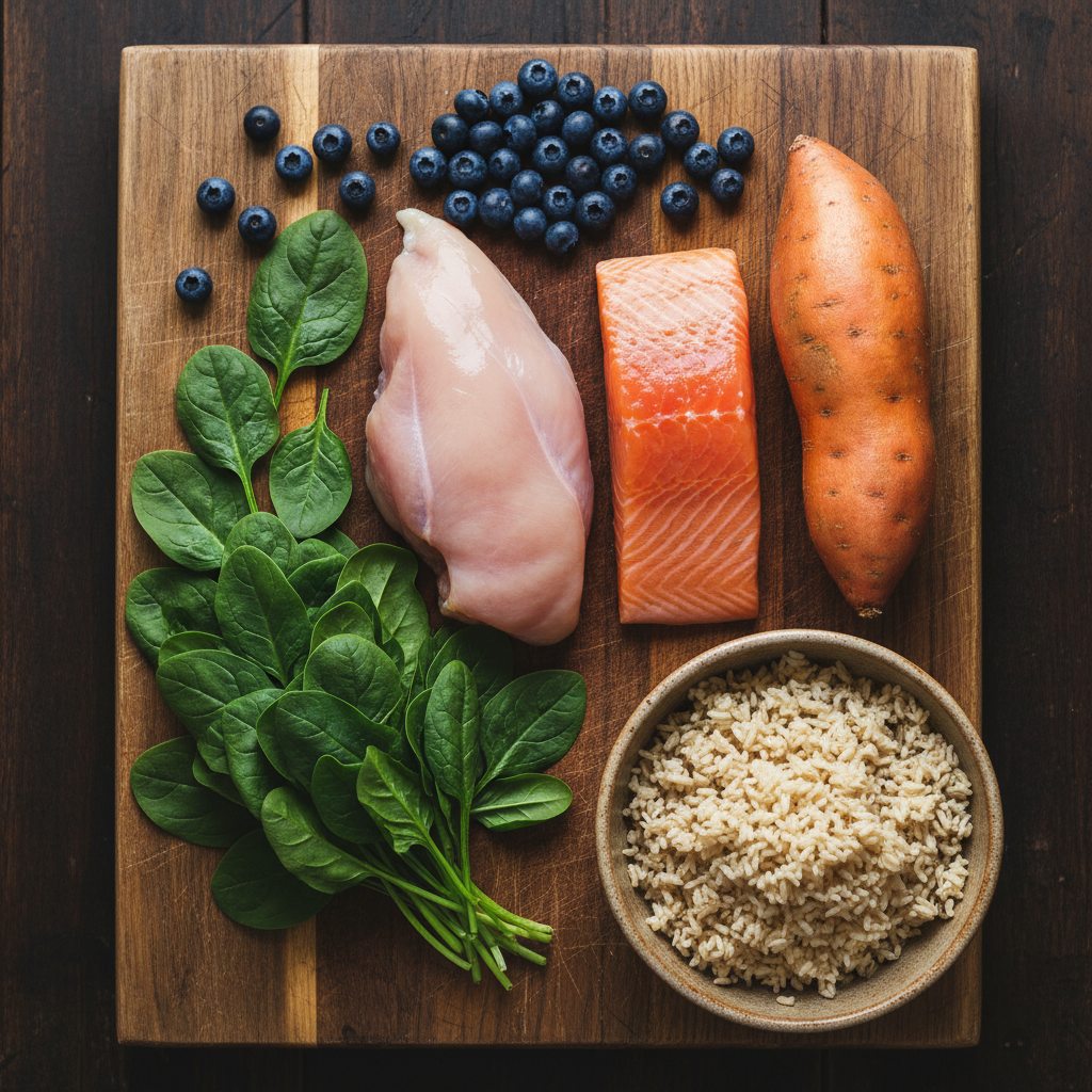 Beef is an excellent source of iron and protein for strong muscles. Sweet potatoes provide complex carbohydrates, fiber, and beta-carotene. Blueberries are a superfood packed with antioxidants to combat oxidative stress from exercise.