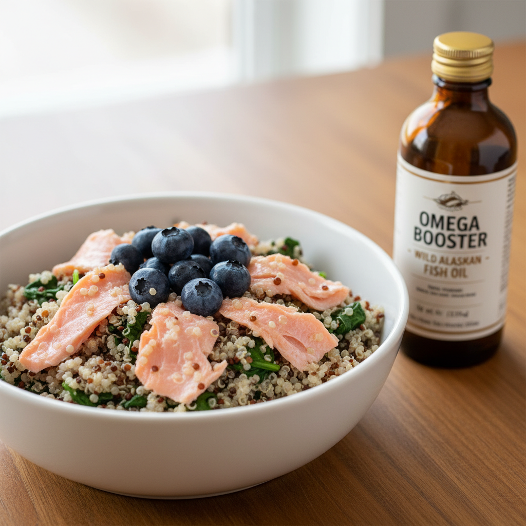 4. Let the mixture cool, then stir in the blueberries and fish oil.