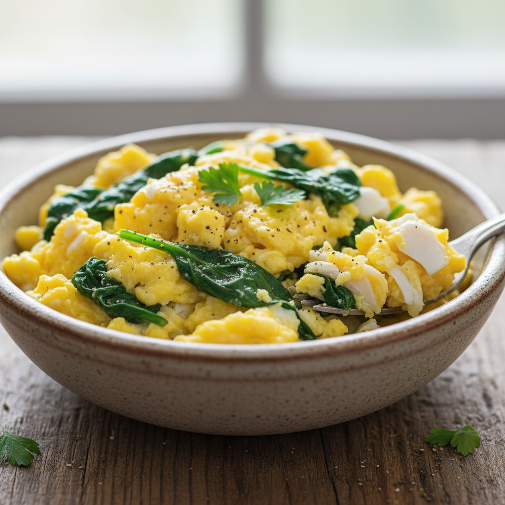 A protein-packed scramble that’s great for a nutritious meal any time of day. Eggs are a fantastic source of amino acids, and spinach adds iron and vitamins. It’s quick, easy, and full of goodness.