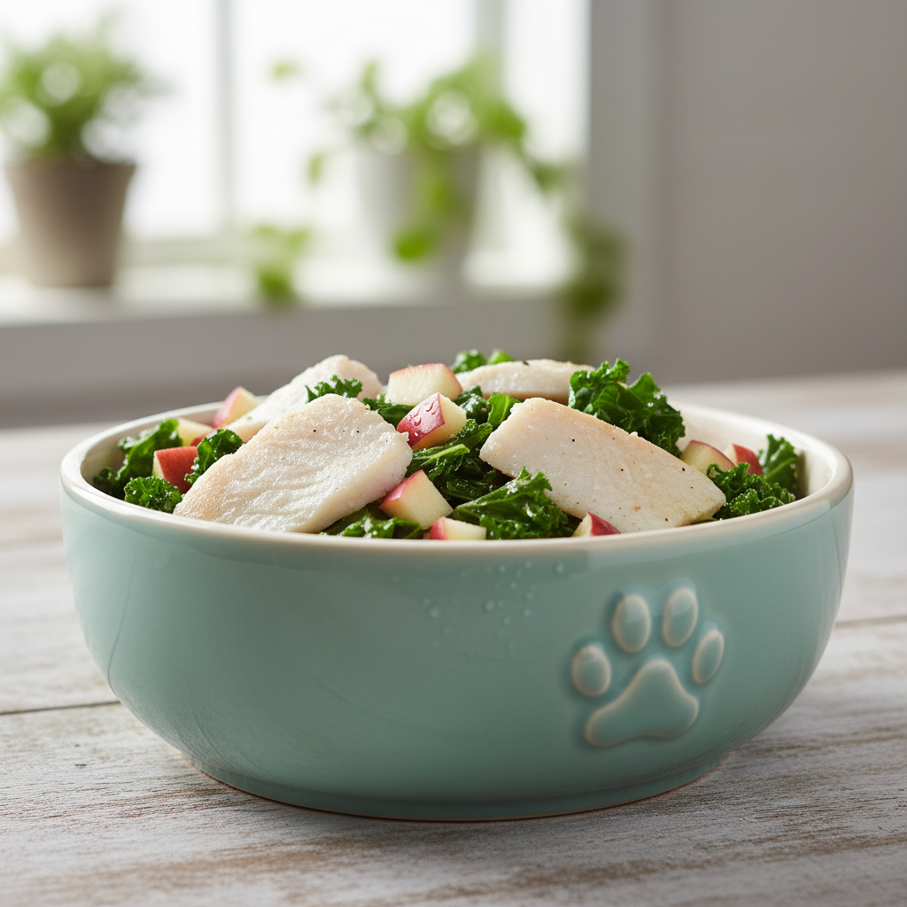 This ‘salad’ bowl for dogs combines the benefits of fish with the fiber of kale and the sweet crunch of apple. It’s a refreshing and nutrient-rich option. Just be sure to lightly steam the kale to make it easier to digest and remove the core and seeds from the apple.