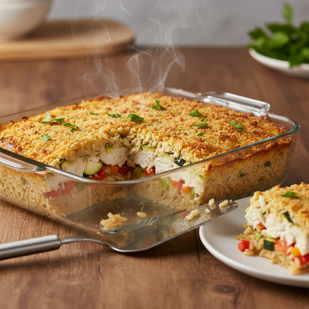 This is a heartier, baked recipe that you can make in a larger batch to last for a few meals. Brown rice offers more fiber than white rice, and baking it all together as a casserole makes the flavors meld beautifully.