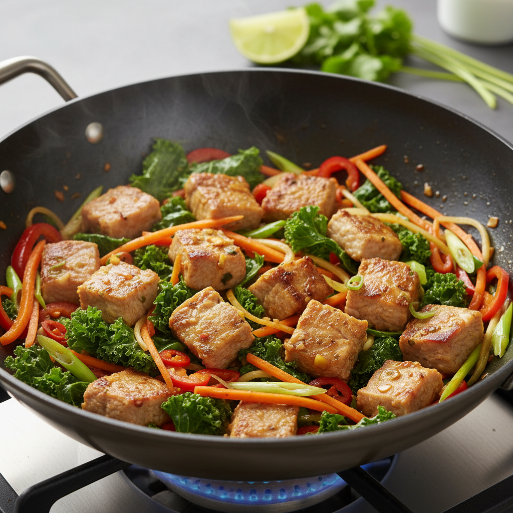 - Add the shredded carrots and kale to the pan. Sauté for 2-3 minutes until the kale begins to wilt.