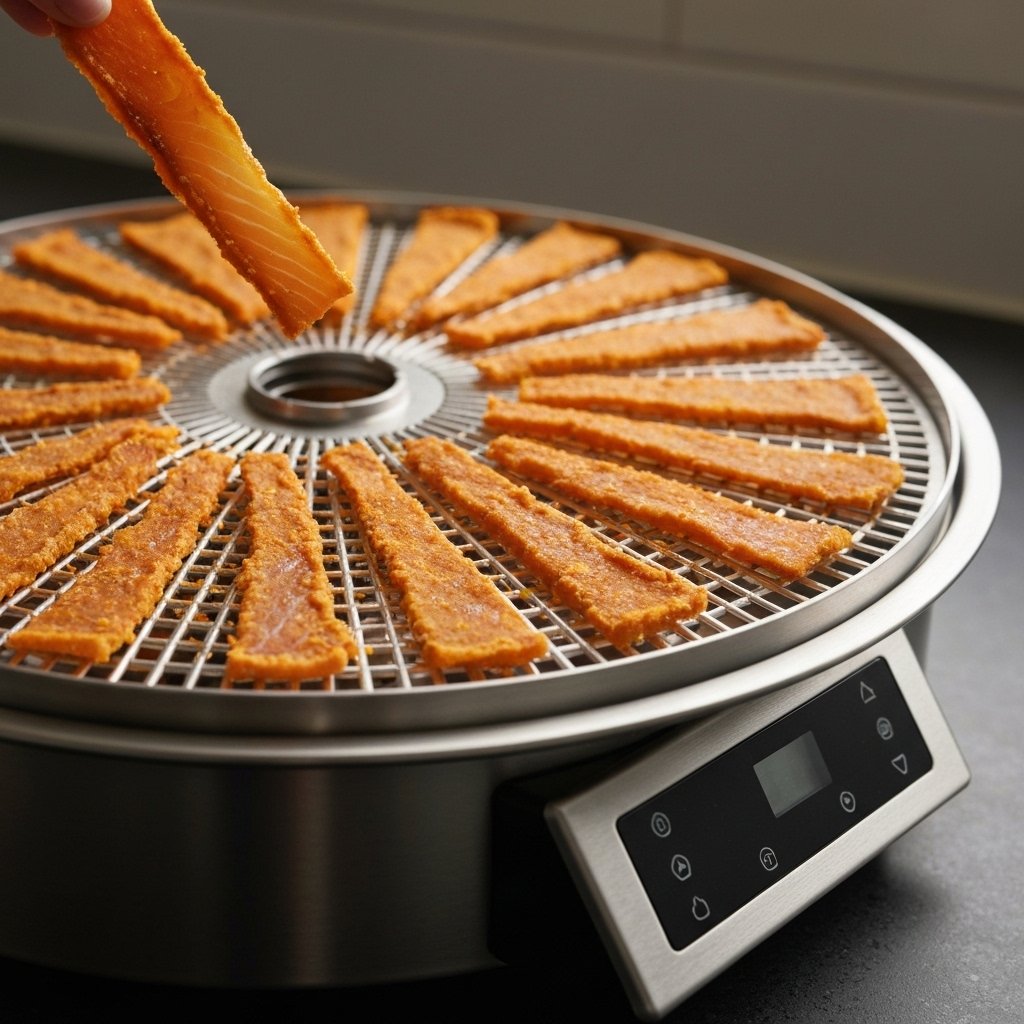 - Place the coated strips on the trays of a food dehydrator, ensuring they don’t overlap.