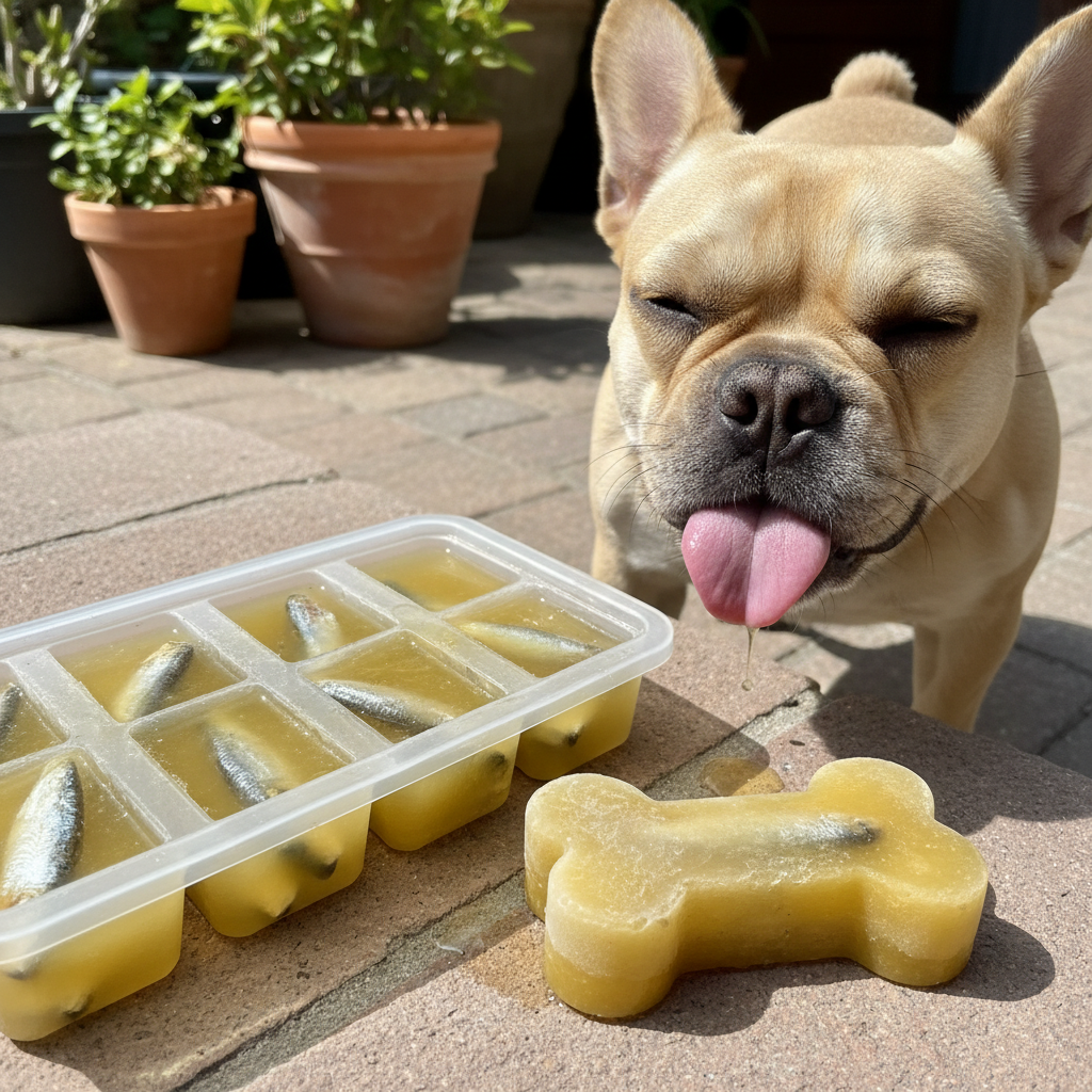 Just place one sprat in each compartment of an ice cube tray, top it up with water or, for a more flavorful option, bone broth (make sure it’s low-sodium and onion/garlic-free), and freeze. On a hot day, pop one out for your pup to lick and enjoy. It’s a hydrating, entertaining, and delicious way to beat the heat. This is also a great option for teething puppies, as the cold can help soothe their sore gums.