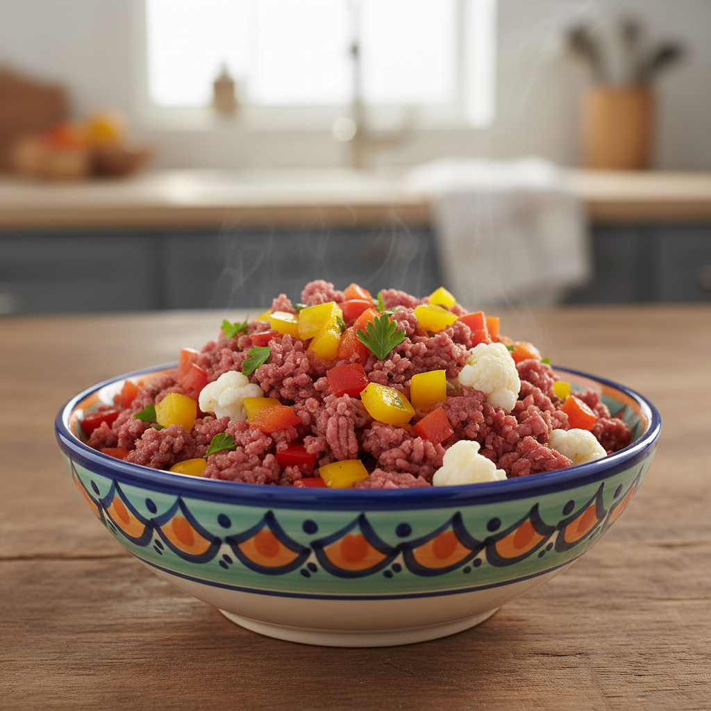 A fantastic grain-free, low-carb meal for dogs who enjoy a heartier texture. It mimics a classic ‘meat and rice’ dish in a much healthier, yeast-unfriendly way.