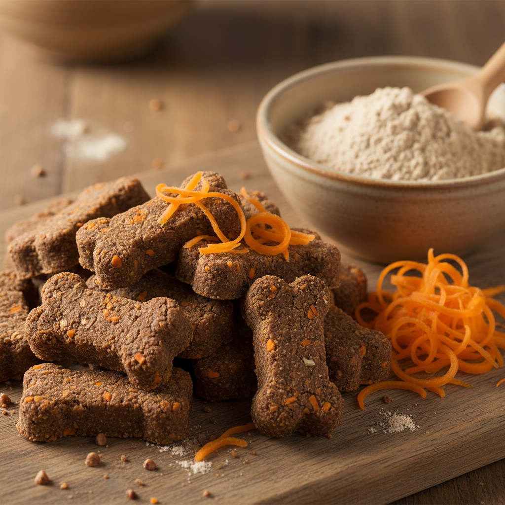 Don’t let the name fool you—buckwheat is not related to wheat at all! It’s a gluten-free seed that makes a wonderful, earthy flour. Carrots provide beta-carotene and a natural sweetness that dogs adore. These crunchy, bone-shaped biscuits are a fantastic grain-free staple.