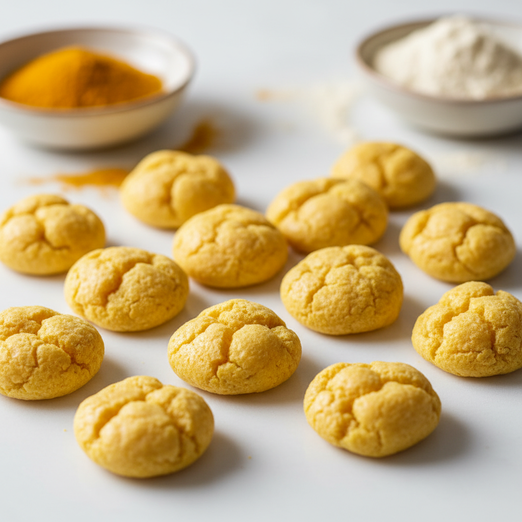 Here’s another fantastic plant-based option. Chickpea (garbanzo bean) flour is high in protein and fiber, and it’s naturally grain-free. We’re adding turmeric, a spice renowned for its powerful anti-inflammatory properties, thanks to its active compound, curcumin. These are light, puffy, and packed with healing power.