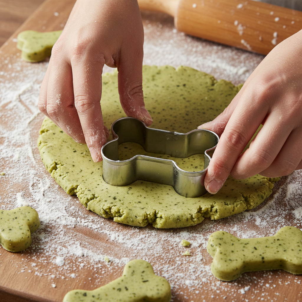 7. Cut Out Your Shapes: This is the fun part! Use your favorite cookie cutters to cut out shapes. Bone shapes are classic, but paws, hearts, or simple circles work just as well. You can re-roll the scraps to use up all the dough.