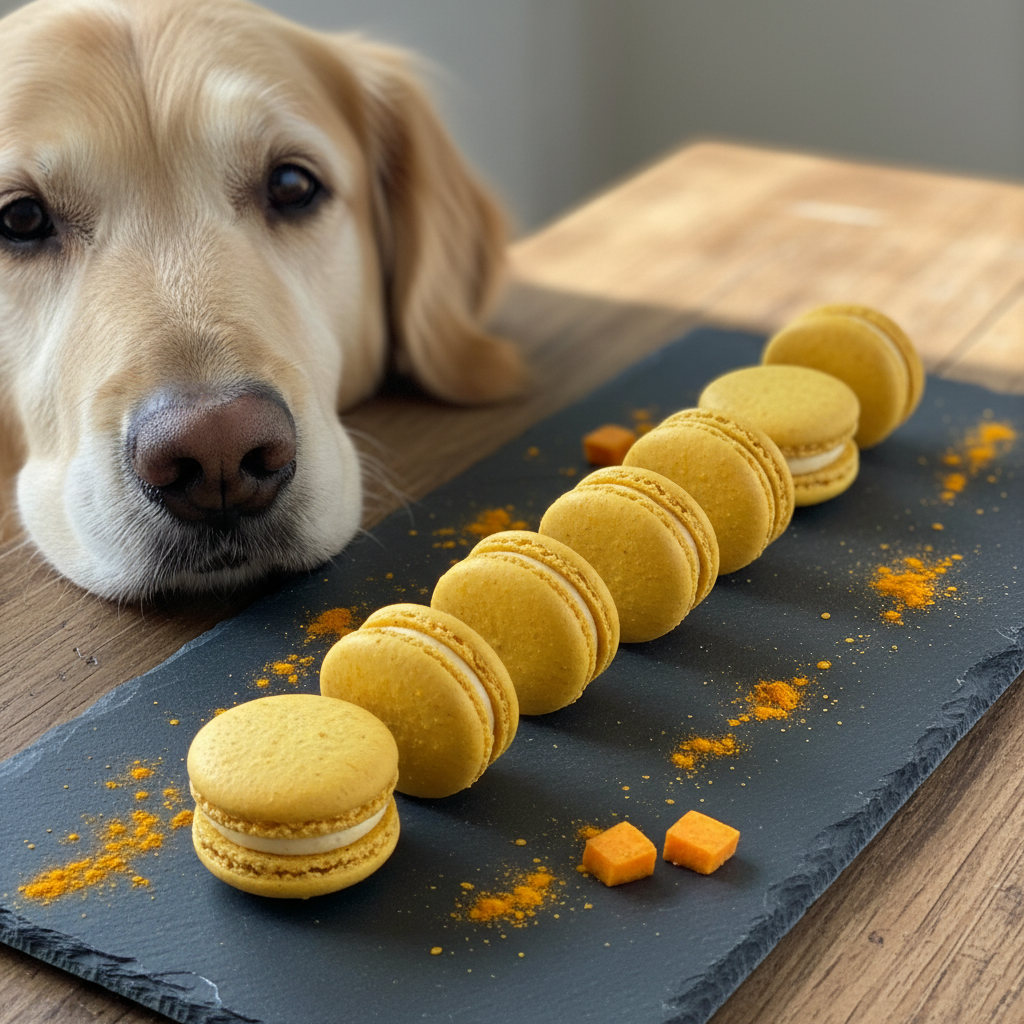 These beautiful golden-hued macarons are a fantastic anti-inflammatory treat. Sweet potato provides a lovely, earthy sweetness that dogs adore, and turmeric is a powerhouse spice for joint health.