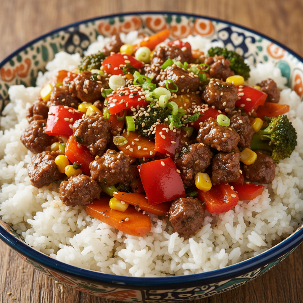 2. In a bowl, mix the cooked beef, rice, and green peas.