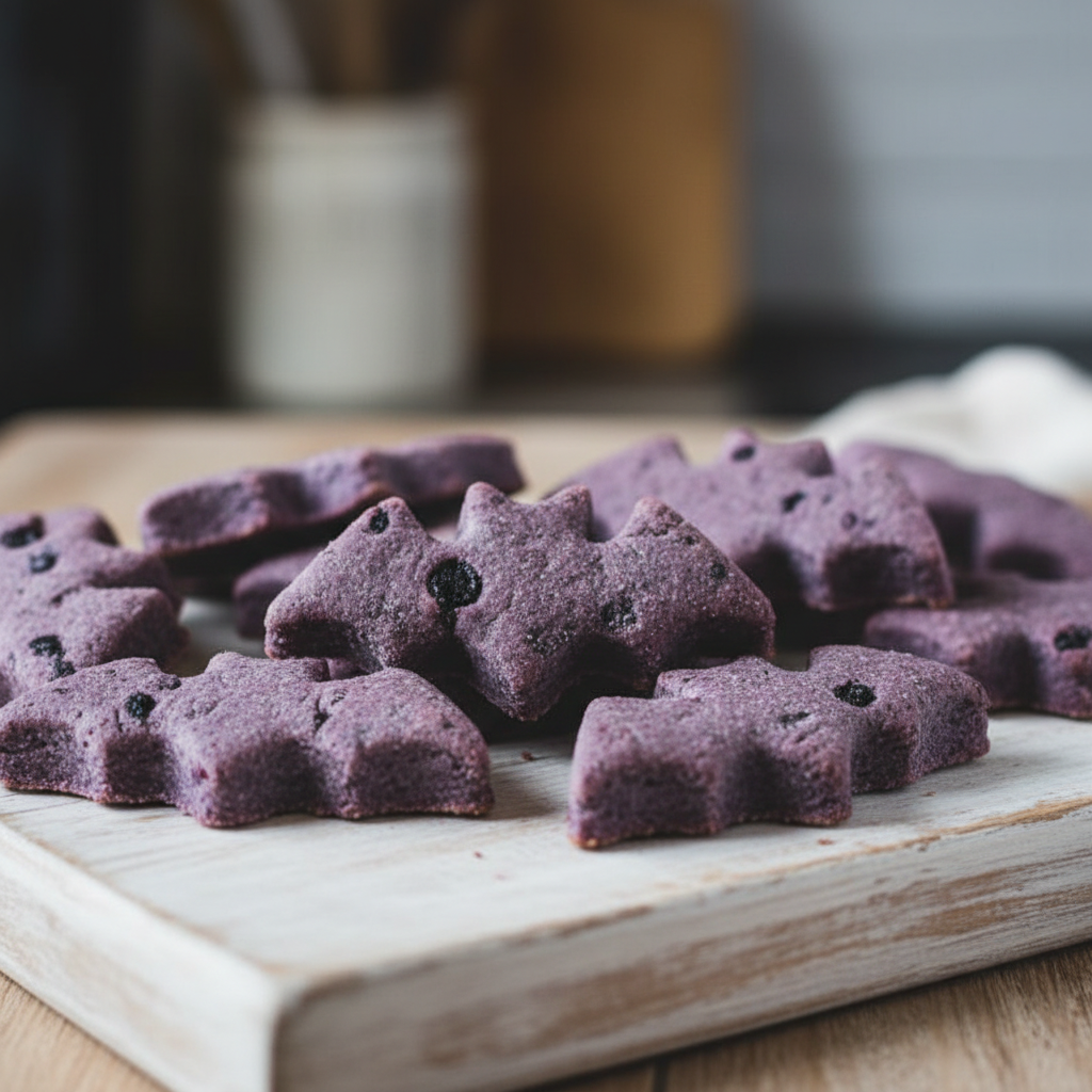 Preheat your oven to 350°F (175°C). In a bowl, mix the coconut flour, pureed blueberries, eggs, and melted coconut oil. The dough will be thick and a bit crumbly. Press the dough onto a parchment-lined baking sheet until it’s about 1/4-inch thick. Use a bat-shaped cookie cutter to cut out the treats. You may need to press the dough firmly into the cutter. Bake for 15-18 minutes. Let them cool fully before serving.