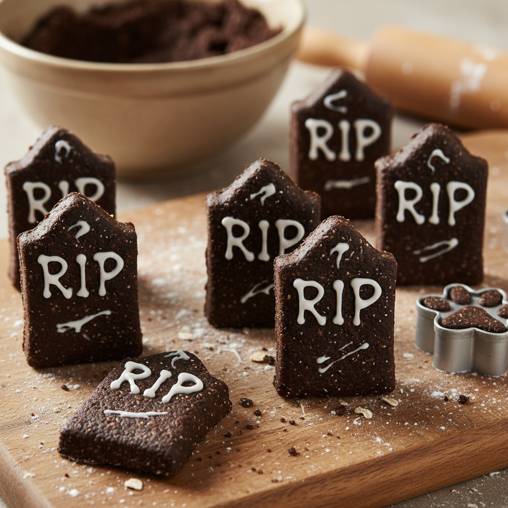 Preheat oven to 325°F (165°C). If you don’t have oat flour, simply blend rolled oats in a blender until fine. In a bowl, mix the oat flour, water, molasses, and egg until a dough forms. Roll out to 1/4-inch thickness and use a knife or a tombstone-shaped cookie cutter to create the shapes. Bake on a parchment-lined sheet for 20-25 minutes. Once completely cool, you can use a small amount of plain yogurt or cream cheese in a piping bag to write ‘RIP’ on each tombstone.