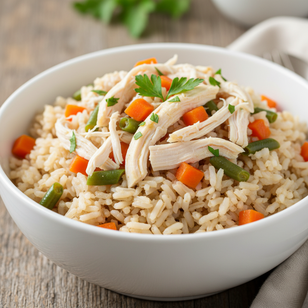 - Mix the shredded chicken into the cooked rice and vegetable mixture. Let cool completely before serving.