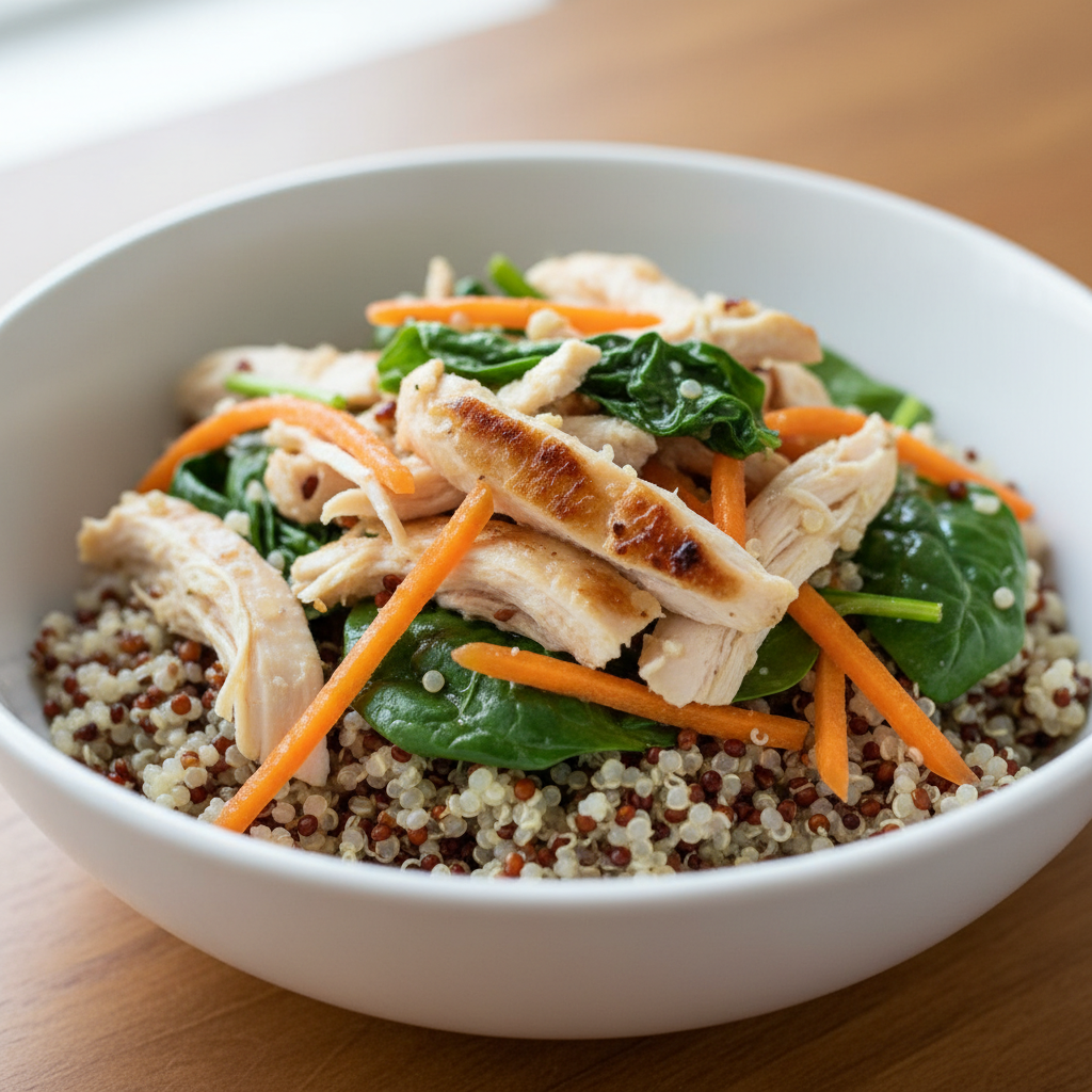 4. In a bowl, combine the shredded chicken, cooked quinoa, and wilted greens/carrot mixture.