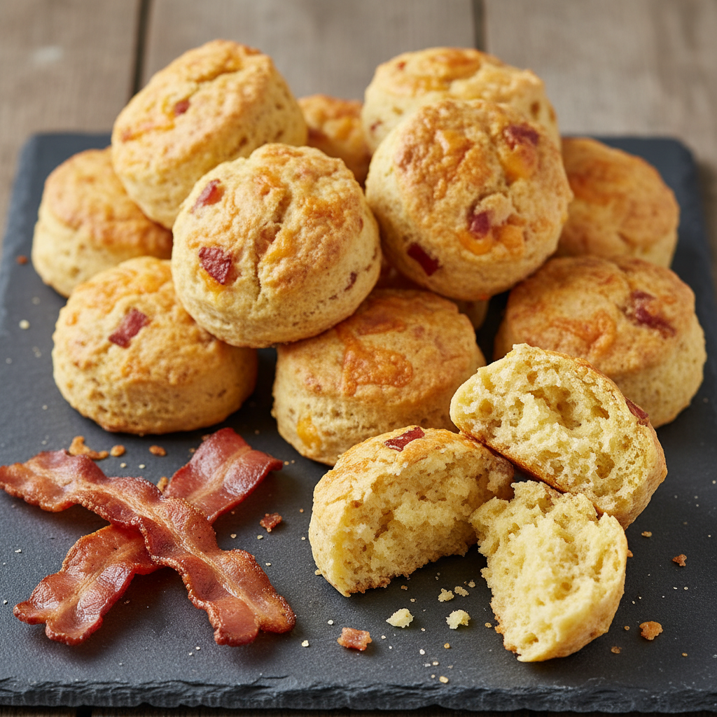 - In a large bowl, combine the flour, baking powder, shredded cheddar, and crumbled bacon. Mix well.