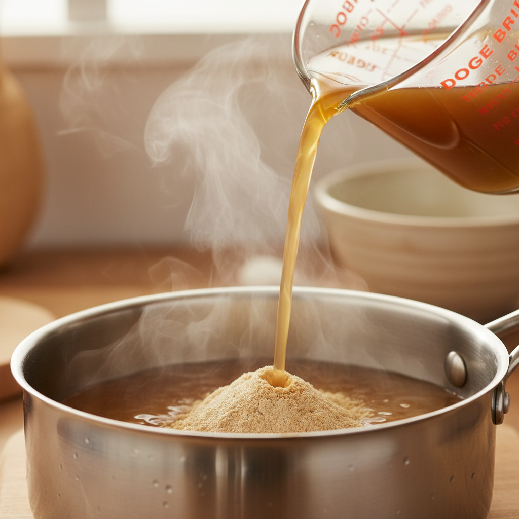 - Sprinkle the slippery elm powder over the cool broth and whisk until it’s completely lump-free.