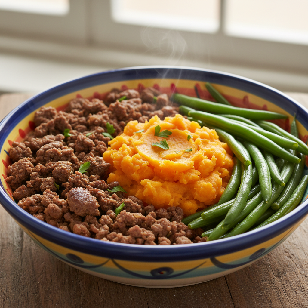 - In a large bowl, combine the cooked beef, green beans, and mashed sweet potato.