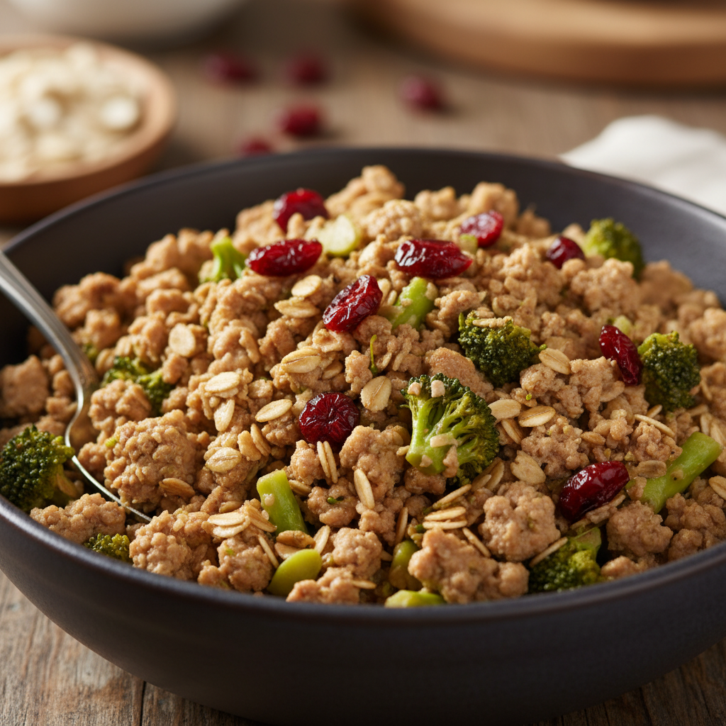 - In a large mixing bowl, combine the cooked turkey, oatmeal, and broccoli.