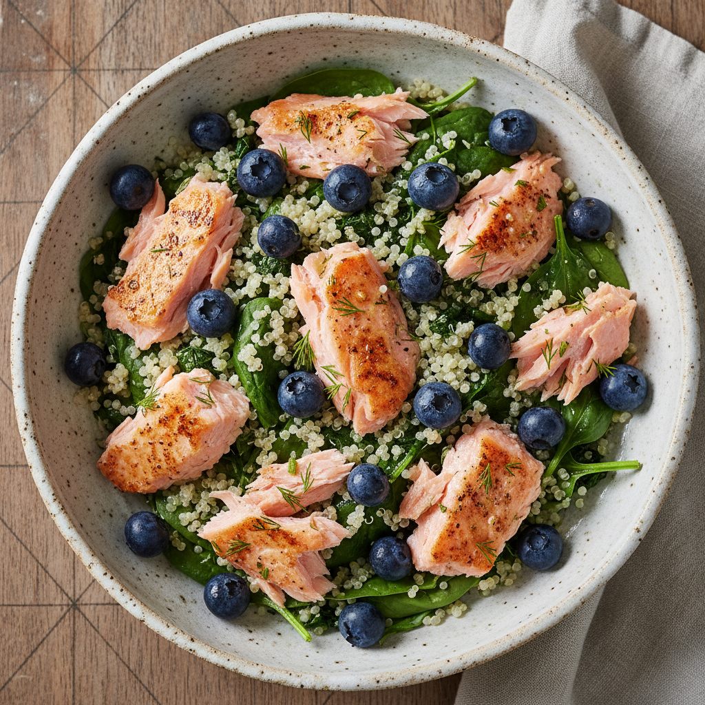 - In a large bowl, combine the flaked salmon, cooked quinoa and spinach mixture, and the blueberries.