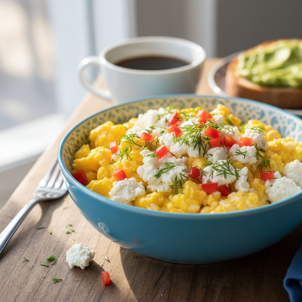 - Remove the skillet from the heat. Fold in the cottage cheese, chopped bell peppers, and dill. The residual heat will warm them through slightly.