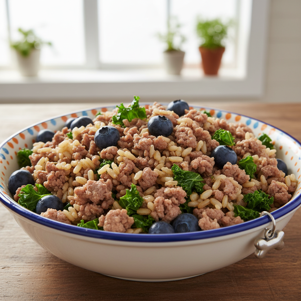 Senior dogs and those needing a little extra immune support will benefit greatly from this antioxidant-rich recipe. Blueberries are packed with vitamins and antioxidants that help fight free radicals, while nutrient-dense kale adds another layer of goodness. This is a light, fresh meal that’s easy to digest and great for overall wellness.