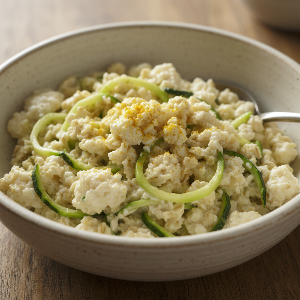 - Add the cooked oatmeal, grated zucchini, and a pinch of turmeric (if using) to the pan with the egg whites. Stir everything together for about a minute to heat through.