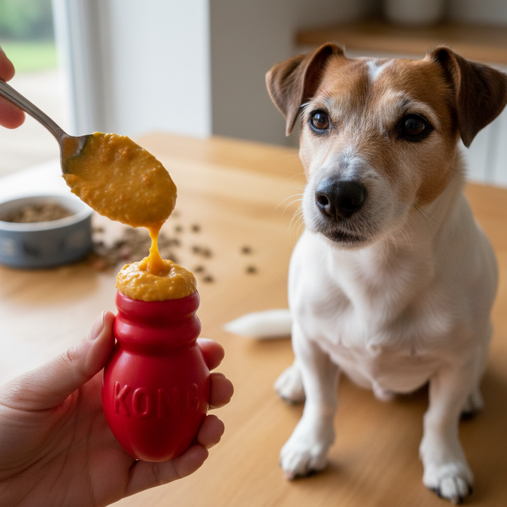 Provides mental enrichment as the dog licks the treat. Can be messy as it melts. Best served outdoors.