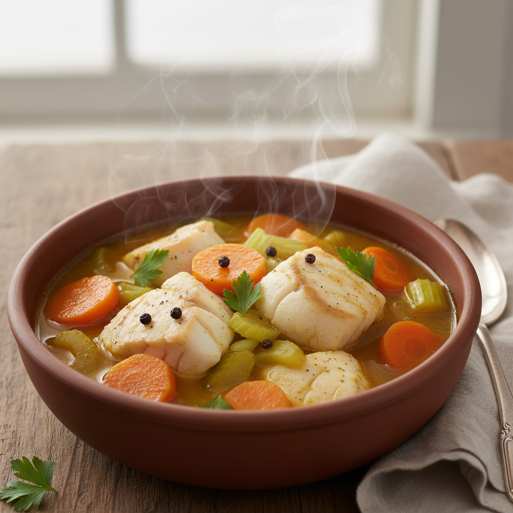 1. In a large pot or Dutch oven, combine the monkfish cubes, diced carrots, diced celery, turmeric, and broth.