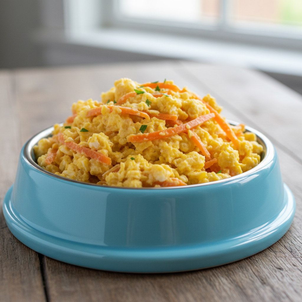 - In your dog’s bowl, combine the cooked oatmeal and the egg-carrot scramble. Sprinkle with a tiny pinch of turmeric.