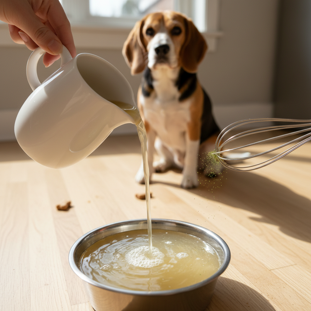 It depends on the size of your dog. A good rule of thumb is to start small. For small dogs (under 20 lbs), begin with 1-2 tablespoons per day over their food. For medium dogs (20-50 lbs), you can give 1/4 to 1/2 cup. For large dogs (over 50 lbs), 1/2 to 1 cup per day is a good amount. You can serve it as a hydrating drink, pour it over their kibble to soften it, or use the frozen cubes as a cool treat in the summer.
