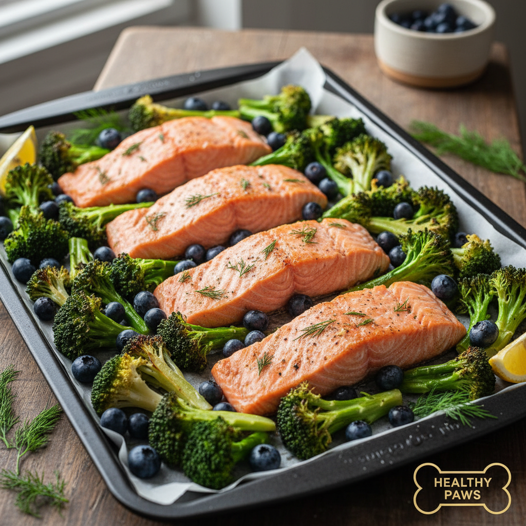 Is your dog’s coat looking a little dull, or do they suffer from dry, itchy skin? This Omega-3-packed recipe is here to the rescue! Salmon is a fantastic source of healthy fats that support skin and coat health, reduce inflammation, and even boost brain function. Paired with antioxidant-rich broccoli and blueberries, this is a superfood meal for your super-dog.