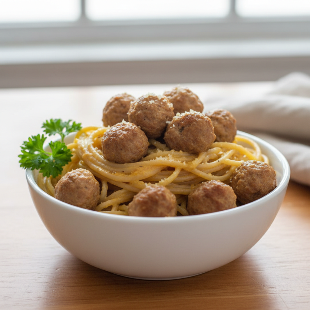 7. Top the spaghetti with a few mutt-balls and serve once cooled to a safe temperature.