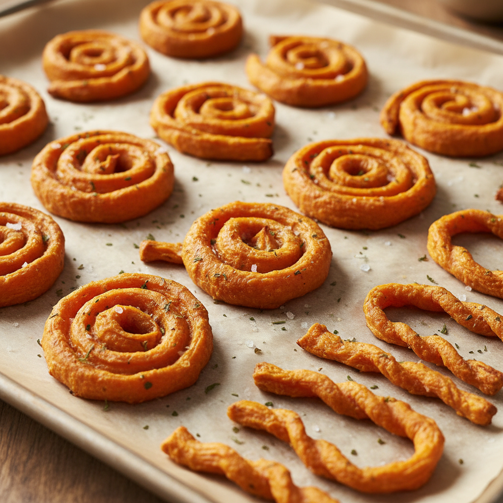 Look for sweet potatoes that are firm, with smooth skin and no bruises or soft spots. Longer, more evenly shaped potatoes are easier to slice into uniform pieces, especially for recipes like the twists or fries.