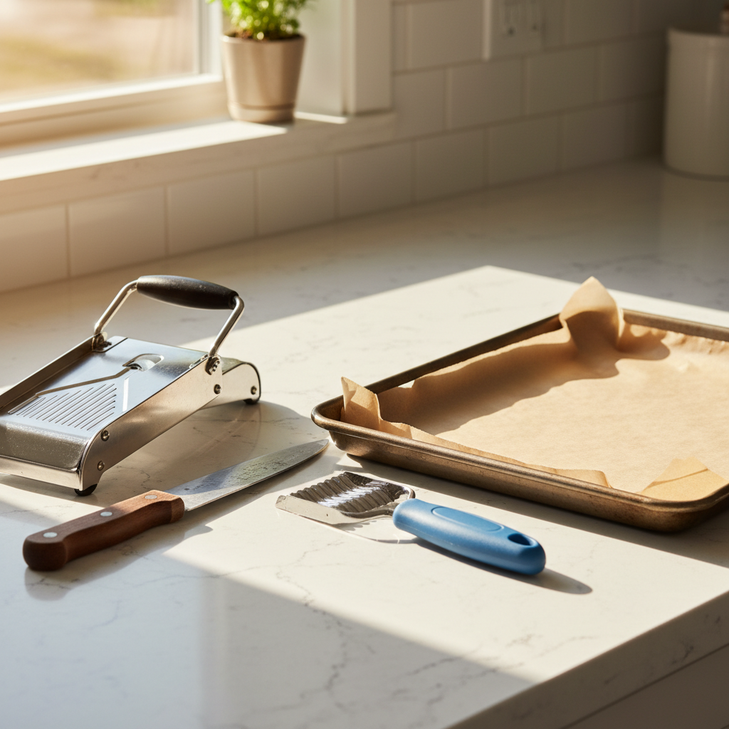 - Using a crinkle-cut knife or a mandoline with a crinkle blade, slice the potatoes into 1/3-inch thick rounds. The thicker cut helps the ridges hold up.